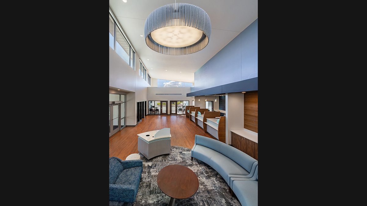 Following the successful renovation of four existing branches, this Batavia location is the first ground-up facility to bring the new prototype to life. The building features a distinctive sloped clerestory roof and expansive glazing that draws natural light deep into the lobby. Custom branded feature walls carry ECU’s refreshed identity throughout the space, while thoughtfully selected acoustical treatments, lighting, and interior materials create a comfortable, cohesive, and memorable member experience.